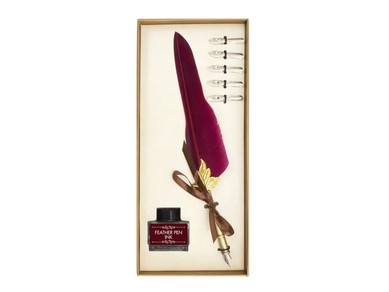 Bu zarif hat sanatı kalem seti; bordo tüylü şık bir divit kalem, beş farklı uç ve mürekkep dolu bir şişeyle birlikte geliyor. şık bir hediye kutusu içinde sunulmaktadır.